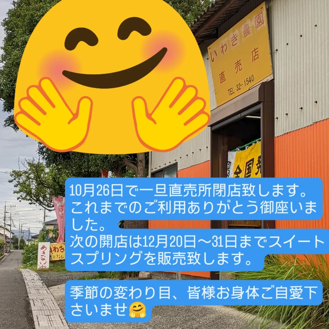 10月20日をもって、一時、直売所を閉店いたします。今年のぶどう、梨は終了いたしました。ありがとうございました。尚、12月初旬より柑橘類(スイートスプリング)を販売いたしますので、引き続きご愛顧のほどよろしくお願い申し上げます。